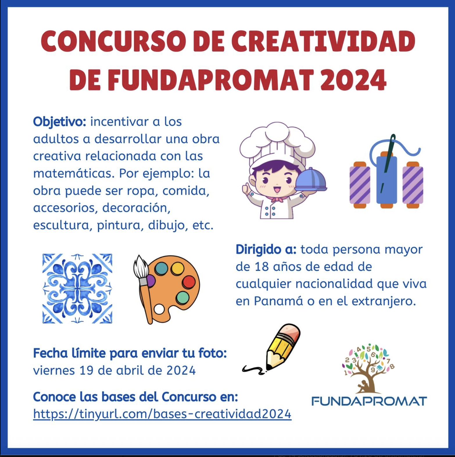 El Concurso de Creatividad de FUNDAPROMAT 2024 tiene el objetivo de incentivar a los adultos a desarrollar una obra creativa relacionada con las matemáticas. Por ejemplo: la obra puede ser ropa, comida, accesorios, decoración, escultura, pintura, dibujo, etc.
