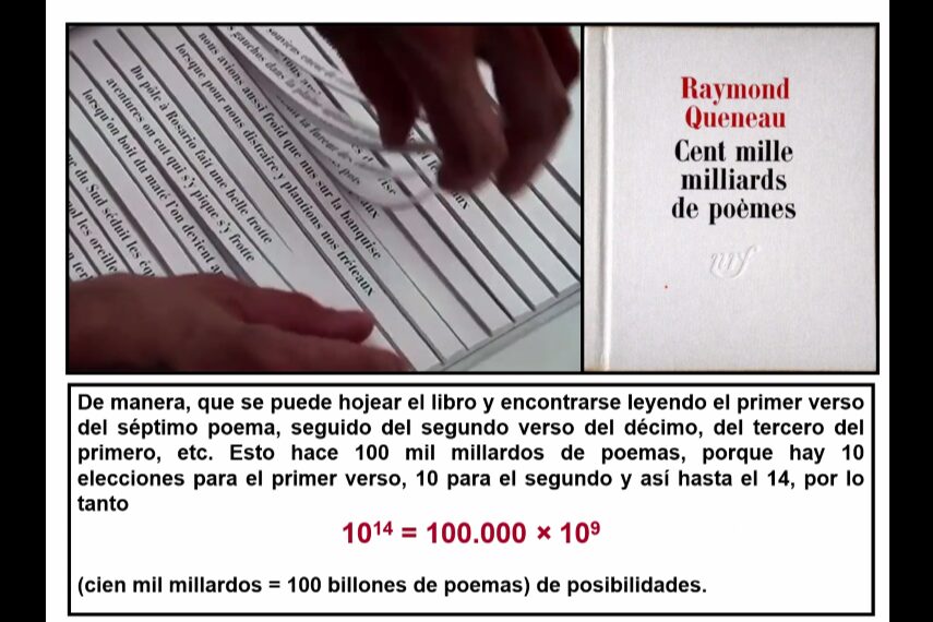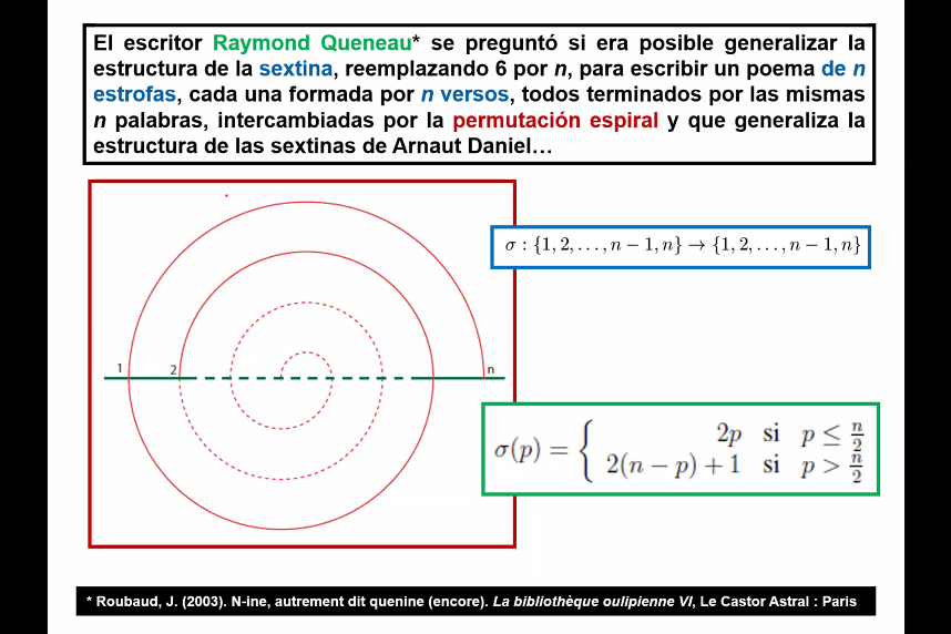 The speaker started the virtual event by commenting on the Chinese poet Su Hui who is known for having created an extremely complex palindrome in the 4th century. Marta Macho-Stadler then shared about the first sextine in the history of literature and how the writer Raymond Queneau asked himself if it would be possible to generalize the structure of the sextine by replacing 6 with n. The speaker also presented on the longest book of the world: A Hundred Thousand Billion Poems by Raymond Queneau and highlighted the book of poems Alphabet by Inger Christensen and the poetry book The Reasons of Water by Francisco Javier Guerrero. This virtual event was co-organized with the Spanish Mathematical Royal Society (RSME).