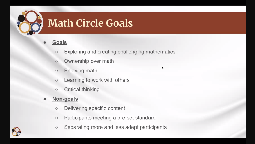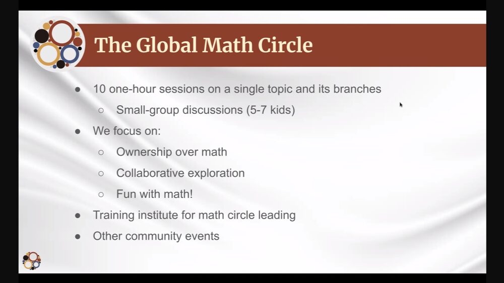 In this Math Webinar in English, Taylor Yeracaris presented on “A True Experience of Doing Math: The Spirit of Math Circles”. The speaker explained that The Global Math Circle was founded by Bob and Ellen Kaplan in order to provide a different way to learn mathematics, focused on exploration and discovery. Taylor Yeracaris described an example of a math circle, which consists of 10 one-hour sessions, with small-group discussions (5 to 7 kids). The speaker emphasized that the goals of a math circle are explore and create challenging mathematics, learn to work with others, enjoy math and develop critical thinking. This virtual event was co-organized by the Mathematical Association of America (MAA) and The Global Math Circle. This was the last Math Webinar in English of 2025.